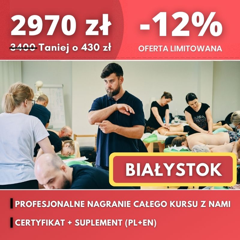Nasze szkolenie w Białymstoku jest otwarte dla każdej osoby posiadającej podstawową wiedzę z anatomii i fizjologii człowieka. Zapraszamy fizjoterapeutów, masażystów, techników masażu, trenerów personalnych, studentów kierunków medycznych i sportowych oraz wszystkich specjalistów pracujących z ludzkim ciałem.